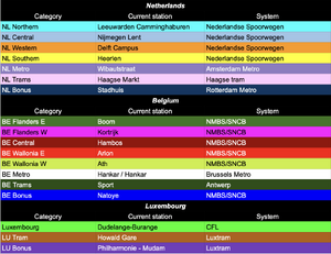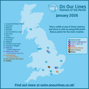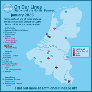 IntroductionStations of the Month is our way of inspiring your adventures. Each month, we'll randomly choose seventeen stations across Great Britain and eighteen stations across the Benelux region from our pre-determined regional categories. All you have to do is visit as many of them as you can and snap a photo or selfie - remembering to make sure that the station is identifiable, of course! - and share it via social media using the hashtag Your photo can be taken with any part of the station - it could be inside, on the platforms or even from a passing train! We just need to be able to identify where you are without too much sleuthing! However, where a station is shared between different 'modes' of transport (for example National Rail and London Underground), be sure to feature the right part if you want those points! Have you got a bit of a creative flair? Then why not aim for some bonus points? You could take The Rapier to Therapia Lane, eat an Eccles cake in Eccles or join one of our social events - let your imagination run wild! The most creative entry at the end of the month will be judged by our Patreons and staff team, and you'll be awarded a nice bonus on our leaderboard. At the end of the year we'll tot all the points together and the person with the most points in each category will win an exclusive prize - and maybe there'll be some other treats on offer too! But remember - it's all in good fun and what we really want to see is where your adventures and imaginations take you! If you want to share any stories, tips or memories of your journeys, we would love if you added them to the relevant station's page here on Bradshaw. All entries to the Challenge are governed by the Challenges Terms. Ready to go? Here's your stations selection for January 2026! The CategoriesWe've allocated every station in a different category. The majority of these are by region, but there are also additional categories for other modes of railed transport that are within the scope of the On Our Lines project. They are as follows: